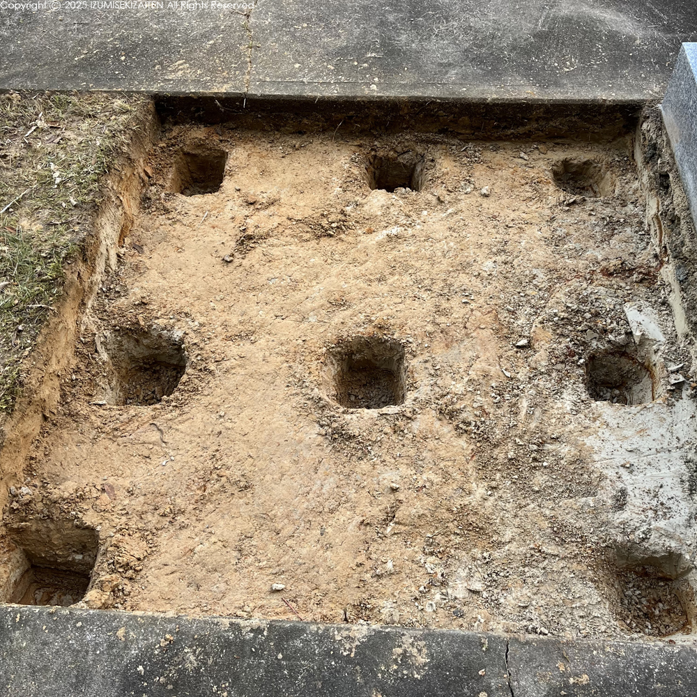阿久比町で施工中の墓石工事の様子です。基礎工事の判断はなかなか難しい問題です。お墓の場合地盤調査をかける事はありません。経験や知識が頼り。今回は盛り土がうっすらと上に盛ってあったのでそれを除去。摩擦を上げるために柱状に改良しておきます。コンクリートで基礎を打設するより良い結果になると判断しました。コンクリートベースの欠点は重くなること。重さは沈下を招きます。