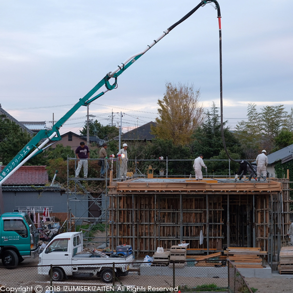 私たちの家の工事はいよいよ生コン打設です。以前に再利用した型枠の事をブログにあげましたが、ついに打設されました。ポンプ車が待機し、ミキサー車が次々にやってきます。