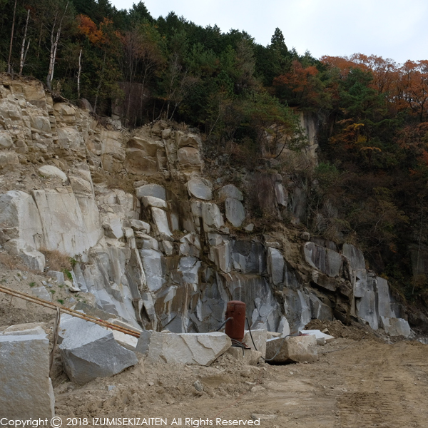 来春までに大府の健康の森西霊苑で岡崎の宇寿石で1件、知多市の知多墓園で岡崎の宇寿石で1件、大府市の寺院坊僧塔は花沢石を小叩き仕上で3基と宇寿石で内室墓を造ります。全て岡崎の工場で日本の職人が加工する石碑となります。写真の花沢石は現在安定して採掘されていまして、来春までの受注には問題無く応えられそうです。採石場として古い歴史を持つ花沢石は、見た目の繊細さや柔らかな石目が人気で、弊社でも頻繁に納めさせていただいています。さて、次は足助の丁場へ移動します。