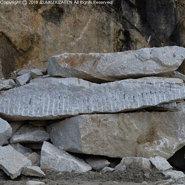 和泉石材店では頻繁に足助の石を使っていますが、最近大きな石が採れなくなったという情報がありまして、今回の丁場視察に向かったのです。丁場の状態を実際に見ると、長い材料が採れにくいのが良く分かります。現在新たな岩盤を目指して誠意掘削中との事で、その結果を受けて来年の工事での割り付けを考えます。