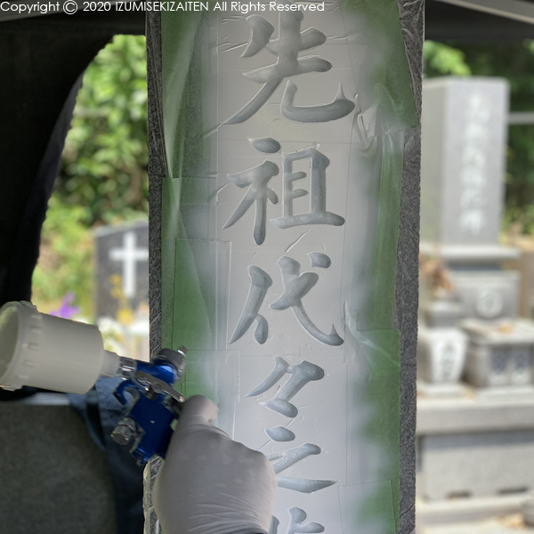 そして塗装作業で最も必要になるのが養生。これを徹底的に丁寧に仕上げる事が大切。正直塗装の品質の大半はここで決着がついてしまいます。石材というのは表面にごくごく小さな凹があります。ここへ塗料が入り込むと、何だか字の周囲が白っぽい印象になってきます。それを避けようと思うと細かな部分まできっちりマスキングするしかありません。手間をかけるかどうか。単にそれだけ。和泉石材店にご依頼いただいたお仕事は全てこういった過程を経て作業されています。丁寧確実な作業をお望みの方はぜひご一報下さい。