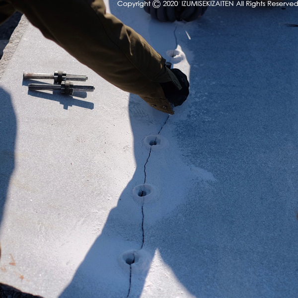 小さなセリ矢を何本も打ち込みます。ピッチや力の欠け具合で割れ方が決まってしまいます。もちろん、狙っているのはグニャグニャに暴れた切断面。他人様の仕事じゃ絶対にやらない仕様。狙いはありますがもちろん石は言う事聞きません。そこが良いのです。
