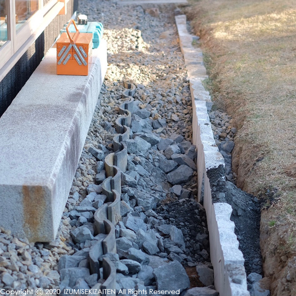 自邸の軒下にある水受けとなります。片側は瓦が並べてありますが、この瓦も成形がいい加減でサイズがメチャクチャ。反ってるし寸法違うし欠けてるし。そういう精度なんで石の方も寛容な姿の方が良いと思ってこうしました。モルタルを一切使っていませんので、後々修正や解体が出来るようになっています。我が家の庭は全てそのスタンス。とにかくモルタルセメント類は使わない。壊れたらやり直すだけ。あとは良い玉砂利等に出会うまで気長に待ちます。