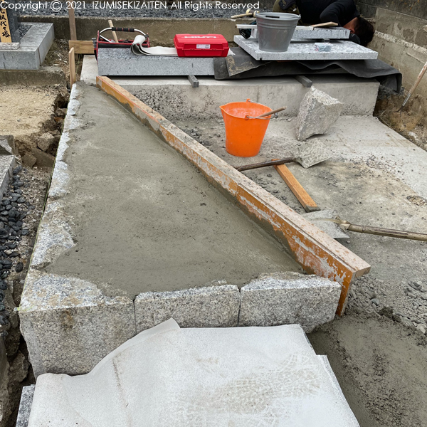 東浦で施工中のお墓が山場を迎えています。大きな重機でガチャガチャ材料を動かしている所はお墓の品質とは直接関係ありません。石屋の側が大変だと勝手に思っているだけ。施主様からすれば写真のような見えなくなってしまう場所の施工をどうしているかが一番大切なのです。この日は間知石の裏込めをしたのですが、コンクリートの配合等細かな調整が必要となります。階段等で比較的高低差が出るお墓の場合、後々白華(エフロ)の問題が出てきます。2年ほど前から2種類の防水剤を比較していますが、今年中には銘柄を絞り込みたいと思います。この辺りの対応が出来ていないと悲惨な結末になります。正しい知識できちんとした施工を行わないと後からでは手遅れ。