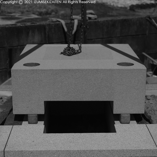 一枚石の台石は重すぎて上がりません。よってチェーンブロックで持ち上げ、石のフレームの上に固定します。地震力にも耐えられるよう外柵と一体化されたお墓は、数百年後には苔むして良い雰囲気になるはずです。デザインした私としては、このお墓の見頃をこの世で見られないのが無念というか何というか。石屋ってそういう仕事なんでしょうね。
