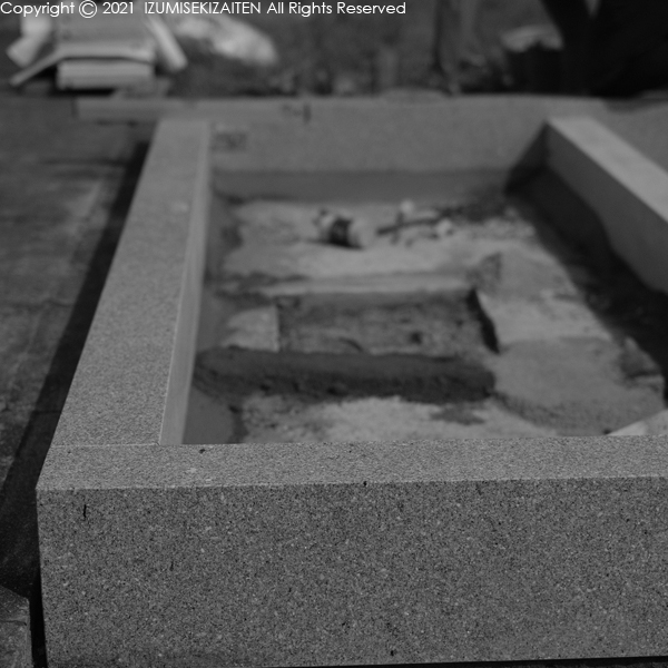 美浜町で工事していますお墓は、外柵は全て水磨き仕上げです。微かな艶がある程度の柔らかい仕上げで、他の石がびしゃん仕上げと小叩き仕上げですので、それと調和するようなかたちになっています。石の使い方として「整える」感覚が大切だと最近思っています。今や加工技術が向上し、かなり複雑な形状まで再現出来てしまいます。ただ、そこにある種の違和感も生まれます。力ずくで何でもかんでもたたき割ってこちらの考える形に変えてしまう感じです。そうではなくて石の表情を整える感覚でデザインすると、何だか石がそれに応えて良い表情を見せてきます。勝手な思い込みでしか無いのですが、そういう感覚は大事にしたいと思います。これからご提案するお客様にもそういうお墓をご用意しました。気に入っていただけるかは分かりませんが・・・・。