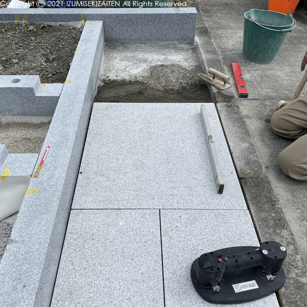 現在岡崎で小叩き仕上の加工中のお墓は、先に外柵の工事が行われています。設置場所の美浜町の現場では、板石を張ったり、周囲の仕上げ工事を行い、完成に向けた準備が進められています。写真の石は岡崎の宇寿石です。全て岡崎で加工されたもので、滑らないようにびしゃん仕上がされています。和泉石材店では足が乗る石に磨き仕上はしません。必ず滑らないような仕上方法をご提案します。