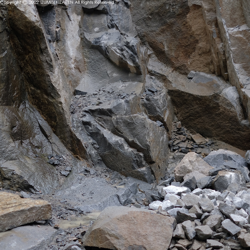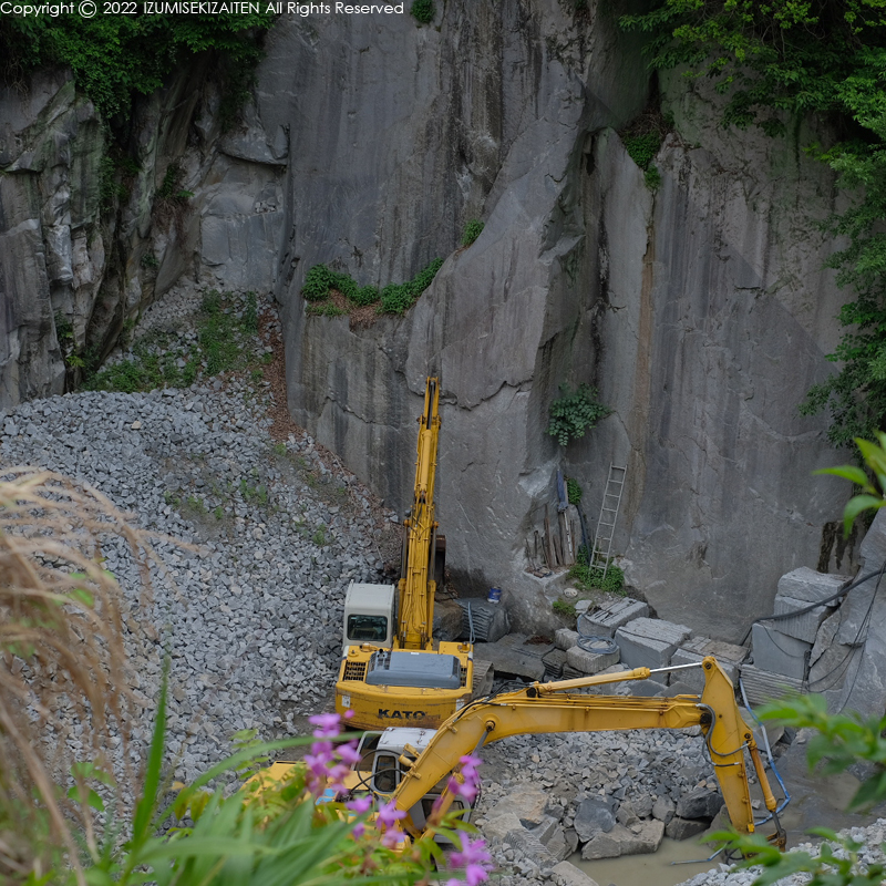 全国的にも相当高価な部類に入るのが牛岩石。とりわけ青い独特の色合いは他にない魅力です。昨年夏に和泉石材店が手がけたお墓はこの牛岩石を小叩き仕上したものです。私は小叩き仕上が一番合うのが牛岩石だと思います。それくらい繊細で深みのある色合いのお墓になります。丁場の岩肌を見てもそんな雰囲気は出ていまして、何だか色が濃く青みが強い。現地へ行けば色とか風合い以上の何かを感じます。それこそ丁場へ足を運ぶ価値がそこにあるのです。さて、次は同じ岡崎市内にある宇寿石です。