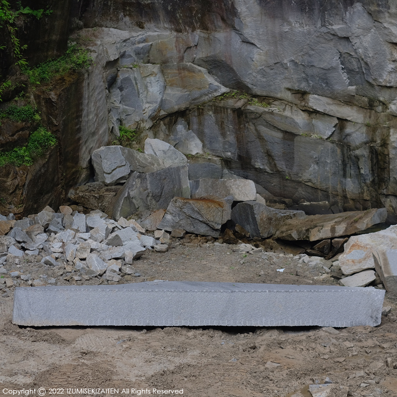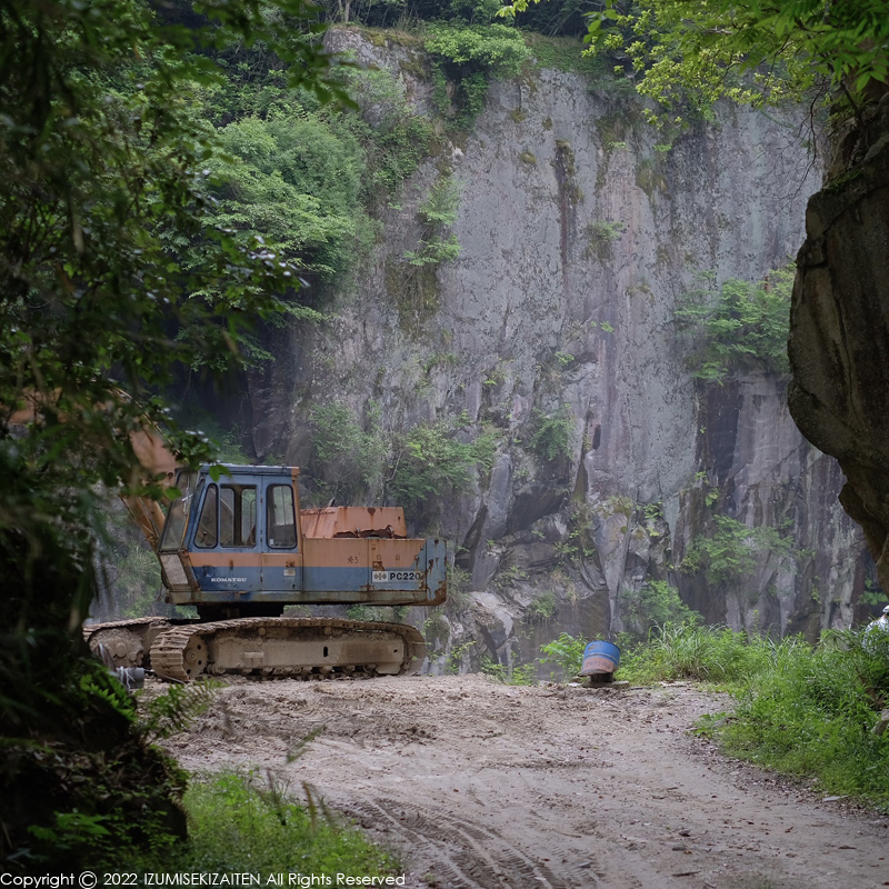 宇寿石が他の石と決定的に違うのは大きな石がとれる事。鳥居などでの採用実績が多いとなると、こういう大きな部材がとれない事には始まりません。和泉石材店でも大きな外柵などは宇寿石で施工する事があります。こういった石は幅広い世界で使えると思います。そういう意味ではポテンシャルのある石なんです。長らくこの地で採掘されてきた銘石ですから、是非ともこれからも採掘が続いて欲しいと思います。