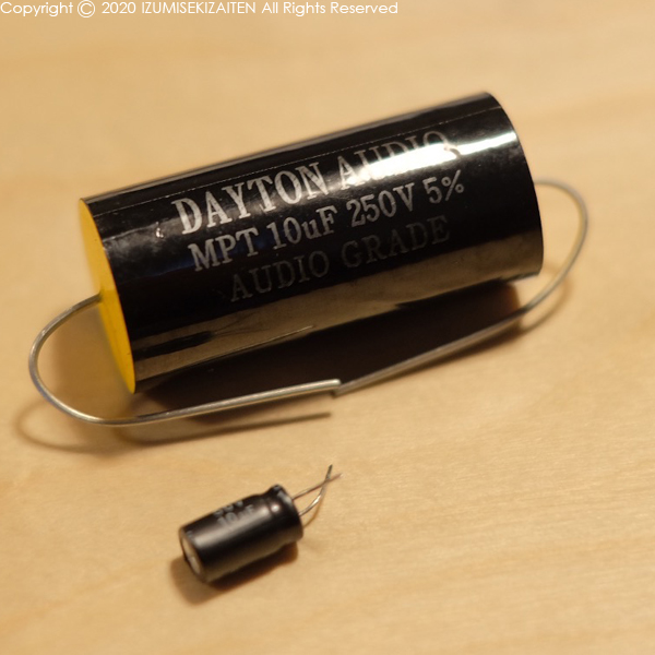 こちらがコンデンサーです。デカイのが交換用に購入したもの。フィルムコンデンサーですが、サイズは10倍くらいありましてスペースが無いと納まりません。今回は何とか納まりましたが、果たして10倍音が良くなっているのでしょうか・・。取り付けは簡単。前に付いていたコンデンサーを新しいものに交換するだけ。極性も何もありませんので、とにかくハンダ付けして終了。コンデンサーはツイーターの担当する音域を制限するためのもので、ある種のフィルターとして作用します。