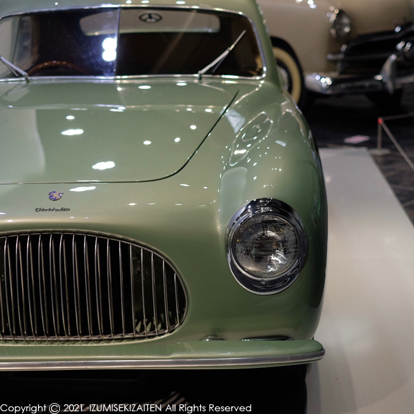こちらはチシタリア。これ以前はフェンダーがボディとは別・・・つまり馬車時代の名残が濃く残っていましたが、その流れを断ち切った記念すべきモデルです。デザインはピニンファリーナ。一度この時代の他の車を見て下さい。思い切り馬車よりのデザインになっていますから。見学しながら自動車デザインの大きなムーブメントが見えてくると面白いです。この次は英国車の黄金期です。お楽しみに〜〜〜〜!
