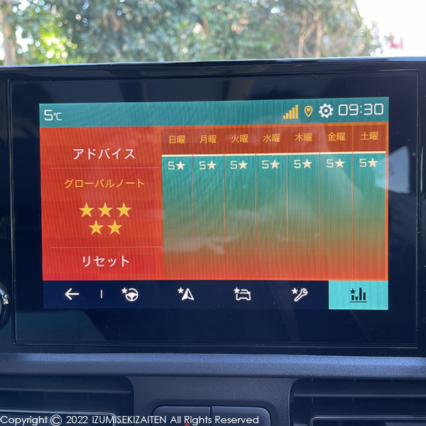 ある日ベルランゴの液晶画面を操作していますと、何やら数値が並んだ画面が出てきました。そもそもこの画面の存在を知らなかったのですが、ドライバーの運転を車両が評価するらしいです。で、堂々のオール5。チンタラ運転している証拠が残っていたわけです。早速この成果を子供に自慢しようと思ったのですが、そもそも今の小学校は五段階評価はしないので、この数値を見ても分からないのです。ある時代までしかオール5の凄さが伝わらないなんて・・・。ちょっと寂しいですが、フランスは五段階評価をしているのでしょうか。気になるところです。これからも安全運転に気をつけます。