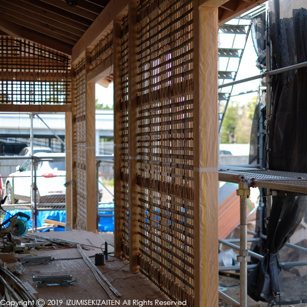 この写真を見て懐かしいと思う方は割の年配の方でしょう。先日私たちの家の現場で行われた竹木舞の施工風景です。施工は四日市の左官屋さん「蒼築舎」さんがおこなっています。若手職人さん達がテキパキと仕事をこなしていますが、土壁という作業内容からすると、信じられない若手ぶり。伝統的な仕事こそどんどん若い人に作業してもらわないと業界の未来はありません。私たち石材業界も見習わなくては!