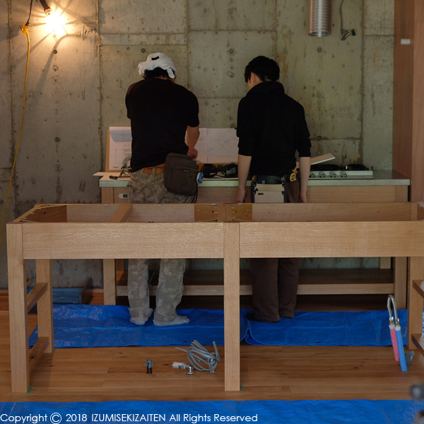最後の大工事はキッチンの取り付け。瀬戸からやって来たスニッカさんがキッチンを取り付けています。ナラ材のキッチンはボーエ・モーエンセンのスパニッシュチェアのようなイメージ。素朴で繊細な雰囲気なんです。そしてキッチンの下にはホシザキの食洗機もあります。問題はちゃんと動くかどうか。