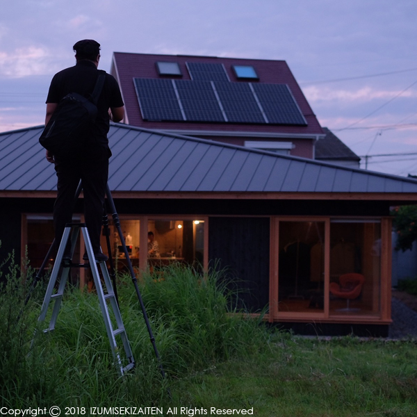 日没後30分が最も大切な時間だそうで、常に駆け足で建物の周囲から撮影が行われました。大きな建築物だと何日にも分けないととても撮影仕切れないと思います。写真のように脚立を立たないと屋根の形が良く分からないそうで、今度自分でも真似してみましょう。今回撮影を担当して下さったのはトロロスタジオのお二人。著名な雑誌の表紙を飾るような方々。良いんだろうか我が家がそんな方に撮ってもらって。最後に家族写真を建築写真的視点で撮ってもらいました。それがもの凄く嬉しかったのです。普通の家族写真じゃありません。ああいう視点は建築写真撮ってないと出てこないです。感謝感謝です。