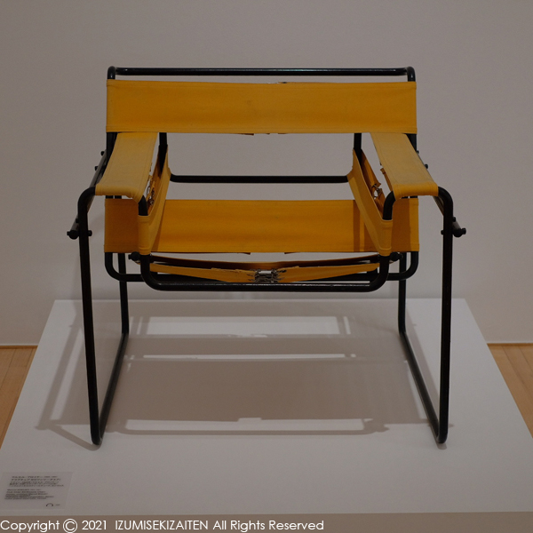 写真はマルセル・ブロイヤーのワシリーチェア。正式名称はクラブチェアB3と言います。ワシリーチェアの名はカンディンスキーが好んだ事で後から付けられた名前です。この椅子には生産していたメーカー等の違いで多くのバリエーションがあります。今回は丁度アームの外側に取り付けられた左右の水平材が、椅子本体に対して外側に取り付けられています。このパターンは見たことがありません。何よりこの椅子をモンドリアン展に合わせて持って来た事が凄い。