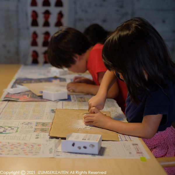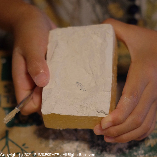 発掘調査キットには小さな道具が与えられます。これを駆使して石膏の中にある小石?的な文化財を取り出すのです。もちろん、メチャンコな堀り方をしたら割れちゃいます。丁寧慎重に作業しなくてはなりません。