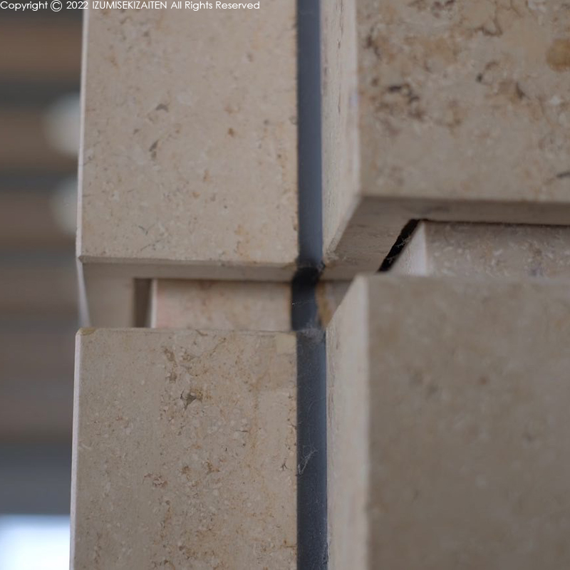 こんな風になっています。上下の石が互いに重なっていまして、底目地部分が石なんです。この巨大な建物でこの精度の納まりを実現するのがもの凄い事です。石を積む事を念頭に入れた石張り工事。出来ている人はほとんどいません。石は積む素材だという事を再認識する納まり。設計段階で素材の事を相当理解していないと絶対に出来ないのです。素晴らしい建築。素晴らしい石工事。