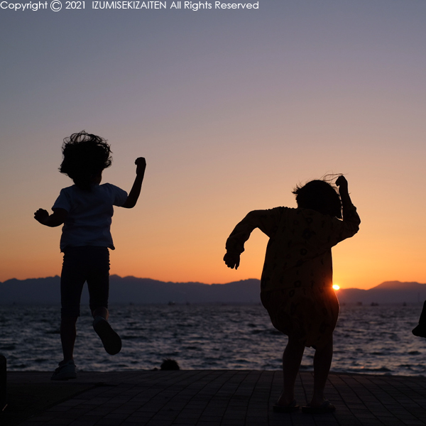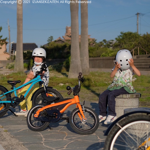 晴れた日は決まって夕陽見学に行きます。そしてこの日は次女が自転車に乗りたいと言い張るので夕焼けツーリング。もちろん父ちゃんも一緒に連れて行かれるわけで、3台で仲良くカルガモ走行をします。長女は調子に乗って一人で暴走。それを咎める次女。10分も走ると飽きてきて海岸を裸足で走る事になります。