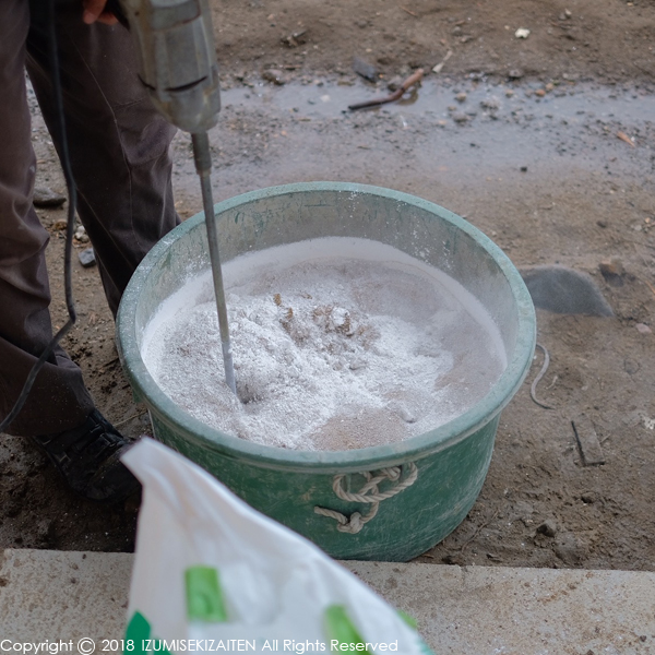 三和土のデータ取りをしてきましたが、いよいよ実際に施工する時がやってきました。極めてリスクの高い作業ですが、周りの人も巻き込んで作業しないと心が折れちゃいます。今回は頼れる石屋仲間に親子で参戦いただきました。先ずは三和土の施工から。事前に決めた配合データ通りに配合したのですが、この日はあいにくの雨模様。コレが後々問題を引き起こすのです・・・。