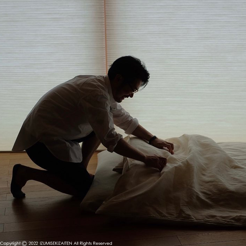 建築の計画中から既に布団を寝具とする事を前提としていました。畳が無い部屋での布団暮らし。現代の暮らしに布団の良さを落とし込む事を目指していました。建物内部の写真に布団が必要不可欠で、ベッドとの最大の違いである「可動性」を強調する写真を撮らせてもらいました。もちろん撮影中に布団に入らせていただきましたが、包み込まれる寝心地と、肌身に合う素材感が素晴らしいのです。