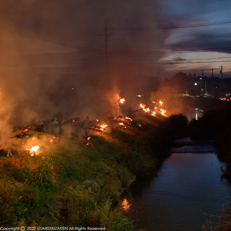 土手に着いたら一斉に着火! 熱いと言うより煙が・・・・・。ものすごい燻りです。
