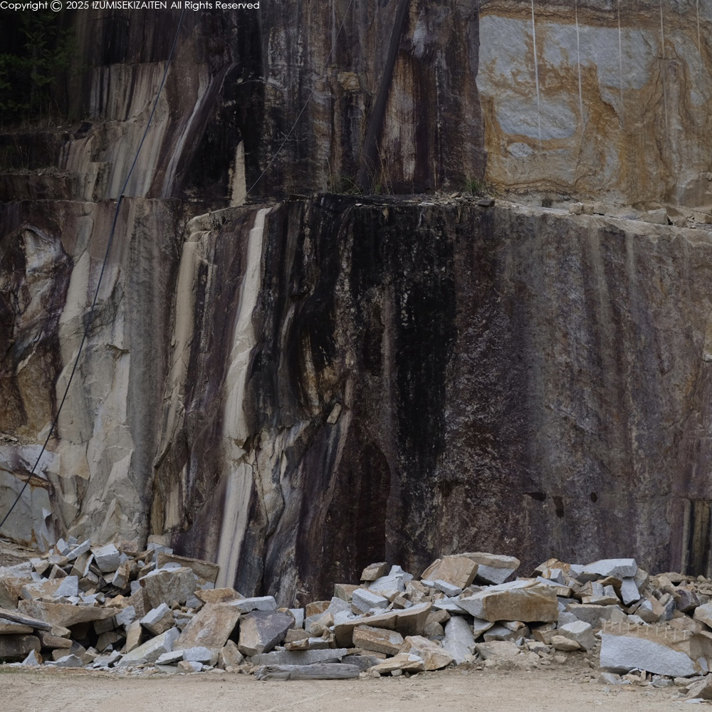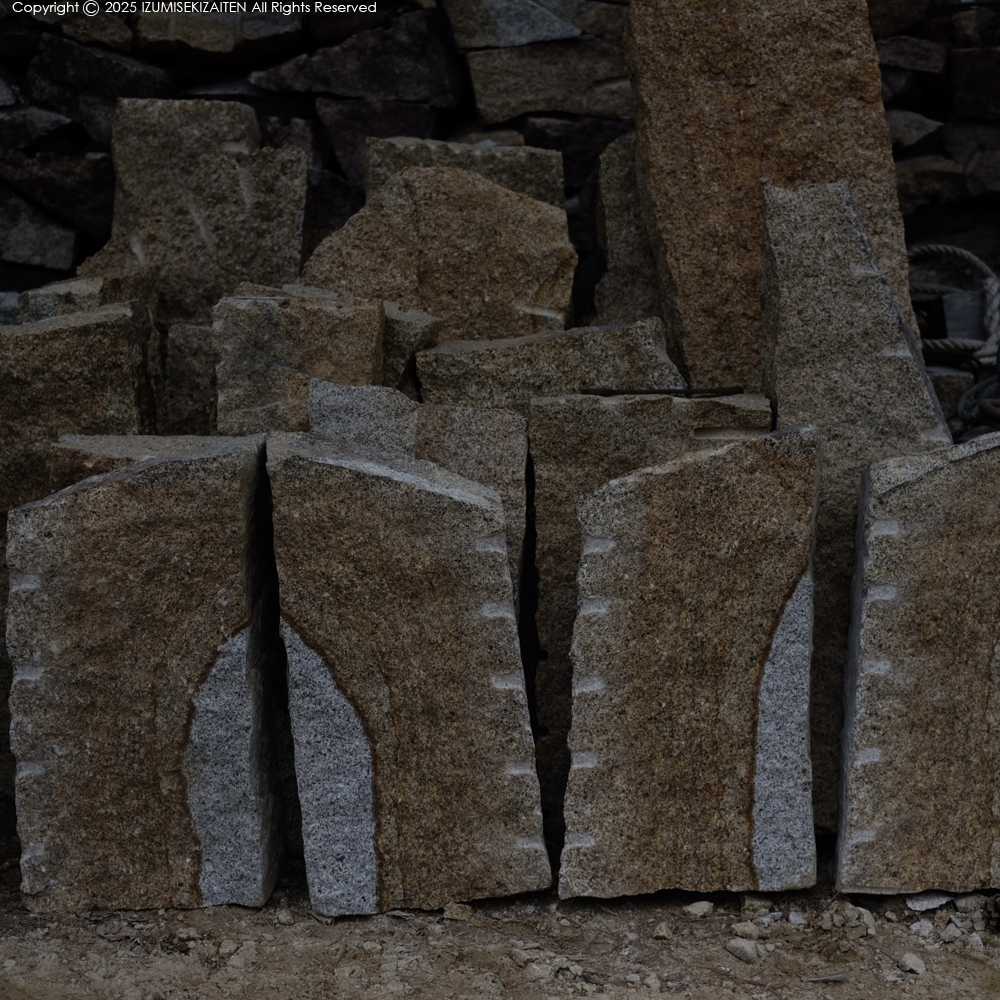 こういう風合いの石を好む人は多いと思います。とにかく風合いが良い。これは岡崎の花崗岩にはない特徴です。ただし、お墓には向きません。錆びるというのが決定的な問題を引き起こすからです。錆びてない場所を切り出してもすぐ錆びてくるようで、お墓には向かないと。基本的には景観材料なのでしょう。