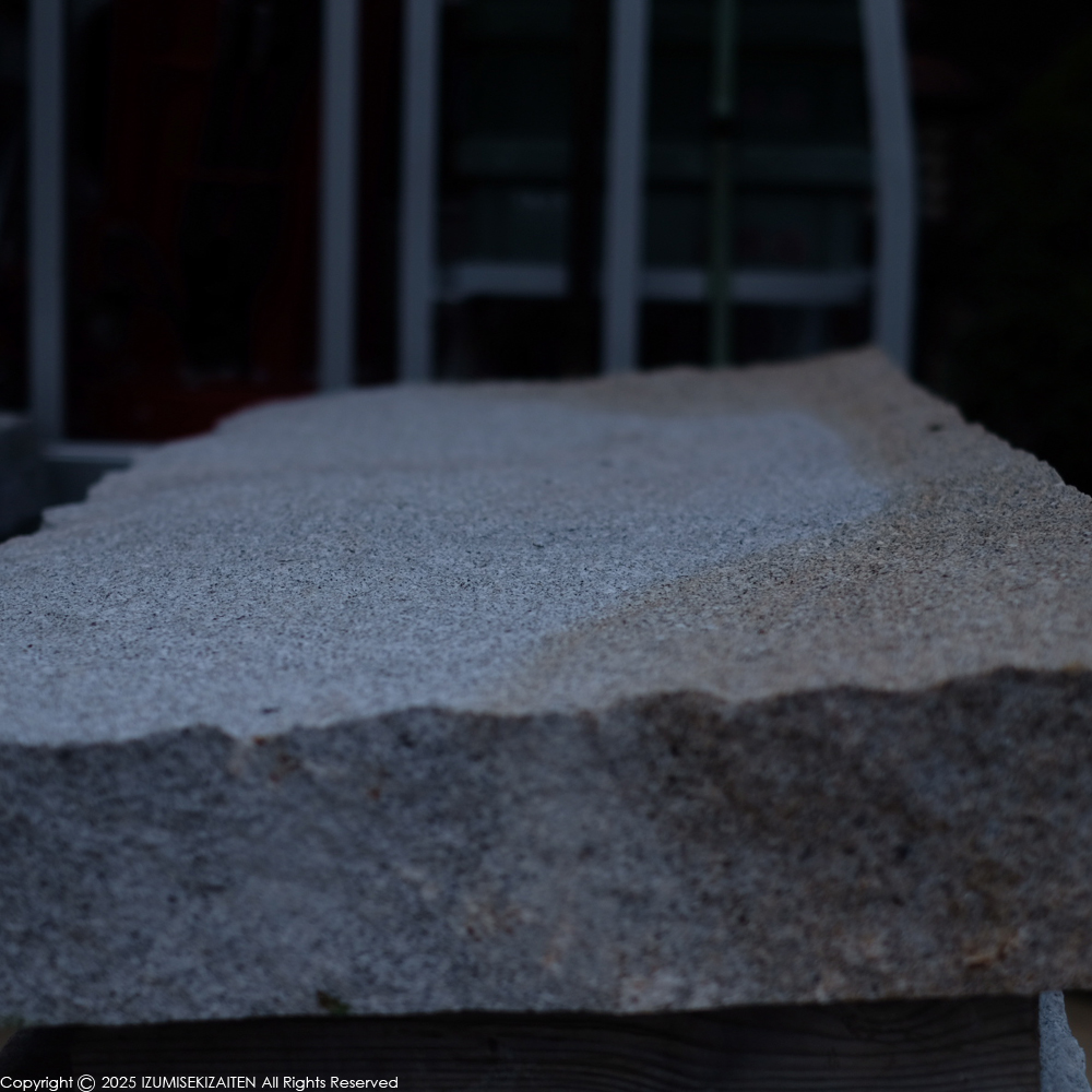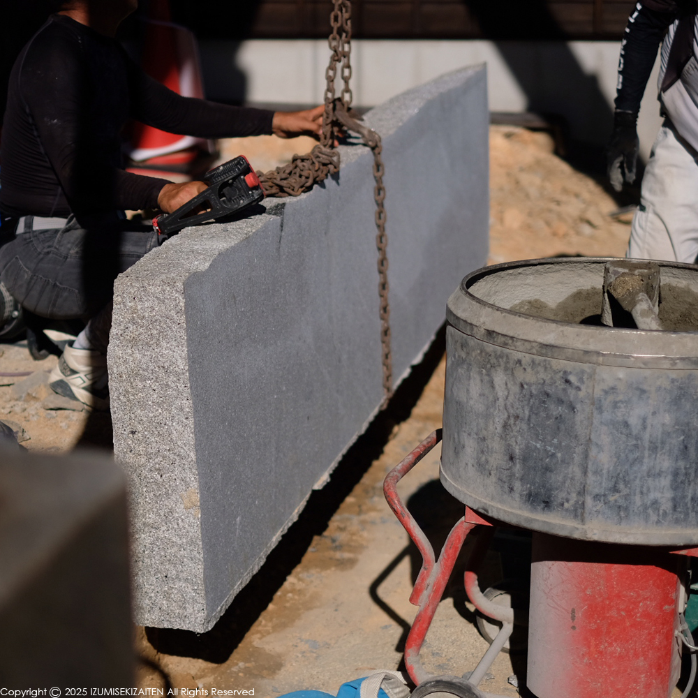 六月に石選びをした工事が動き出しております。石丁場で直接選んだ石ですので、格別な思いがあります。それを同料理するかは私たちにかかっています。今回は山から切り出した石であることを極力残したいので、手を入れる範囲を慎重に検討しております。基本的に山で規定寸法に割っていただいたので、そのまま使用します。スロープという性格上一面だけは切削面となっております。