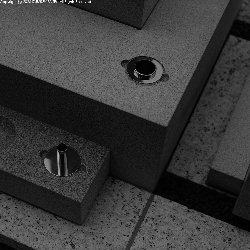 びしゃん仕上、水磨き、小叩き仕上の三種類がこの写真に使われています。足を置くような場所に磨き仕上げは御法度ですのでびしゃん仕上に、極端に汚れる場所は水磨きが一番具合が良いとか、仕上げの使い分けには根拠があります。更には目地材も2パターンの使い分けがしてあります。それに合わせて足助荒目と花沢石を使い分けております。石の特性と仕上げの特徴が一致していないといけません。それをシンプルにまとめ上げるのが最大の難関。結果として線香蝋燭立ては和泉石材店の特注品に。足し算が中心の墓石業界ですが、和泉石材店は引き算が基本。シンプルな墓石をお探しの方はぜひ和泉石材店へお声がけください。