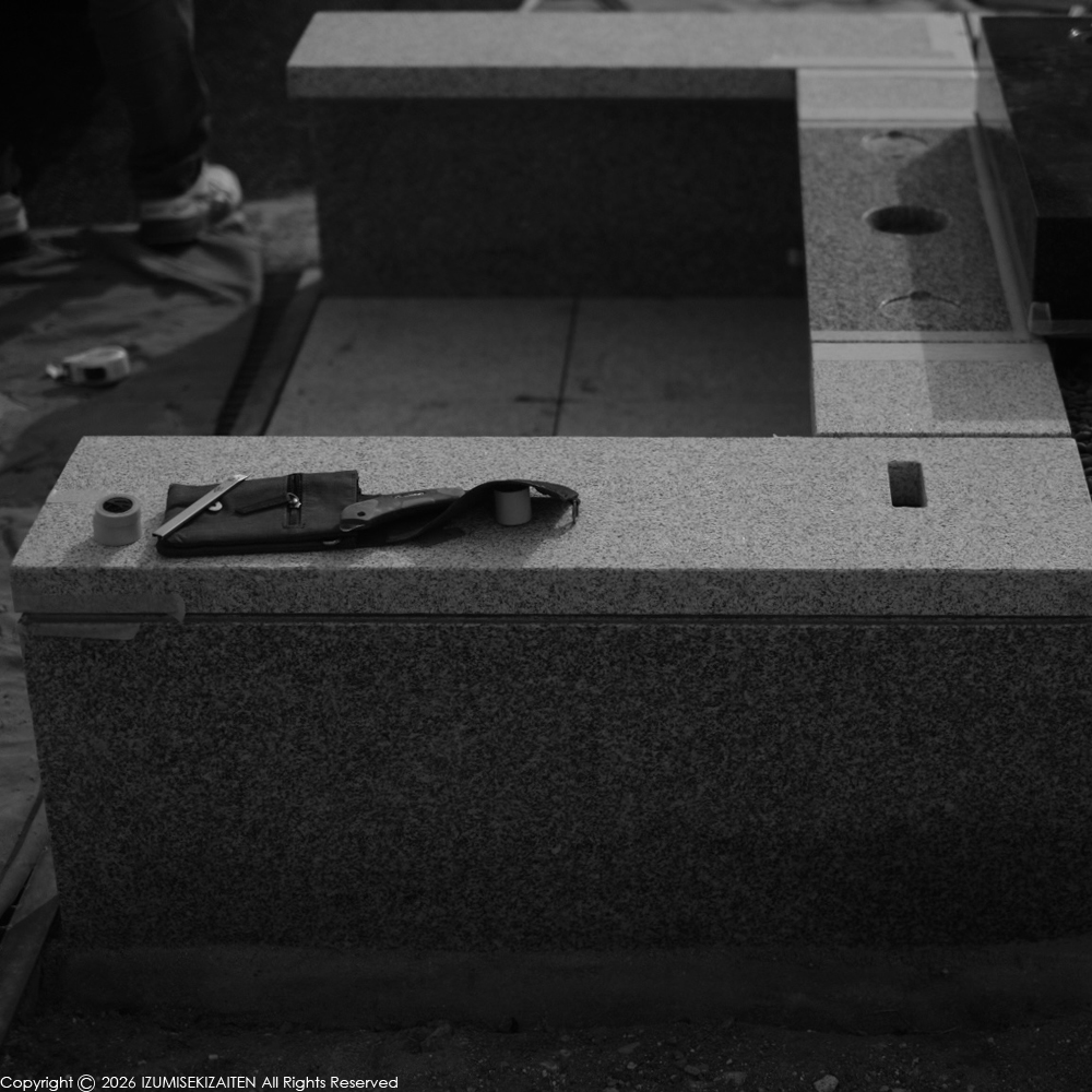 お彼岸前のスパートが始まっています。写真のお墓は大府市の大府森岡墓苑で工事中の、車椅子でもお参り出来る設計になっています。電動車椅子や電動カートなども対応。従来のお墓では考えられなかった条件。もちろん墓地自体のバリアフリー対応が条件となりますが。与条件をシンプルに、美しくまとめるのが私たちの役目。そのために各種金具類も全て和泉石材店特注パーツで構成しています。もう少しで完成です!
