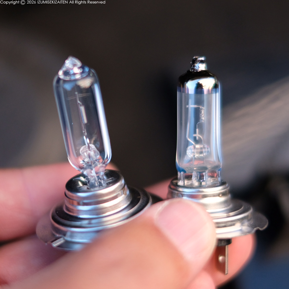 ニュース 車 ヘッドライト DATE 2026.04.09 車検を終えたベルランゴですが、ヘッドライトの照度は徐々に落ちています。写真の右側のバルブは3年経過したもの。何だか白ぼけています。ハロゲンライトは穏やかに劣化。概ね3年で交換しています。 3400K辺りの色温度が一番視界が良いです。特に雨+夜の視界不良時に強い。ハロゲンヘッドライトは寒冷地でも強い。先進性がないとか色々言われますが、未だに信頼性は最も高いと思っています。 CAT:ニュース | 車 一言石句 TOP prev
