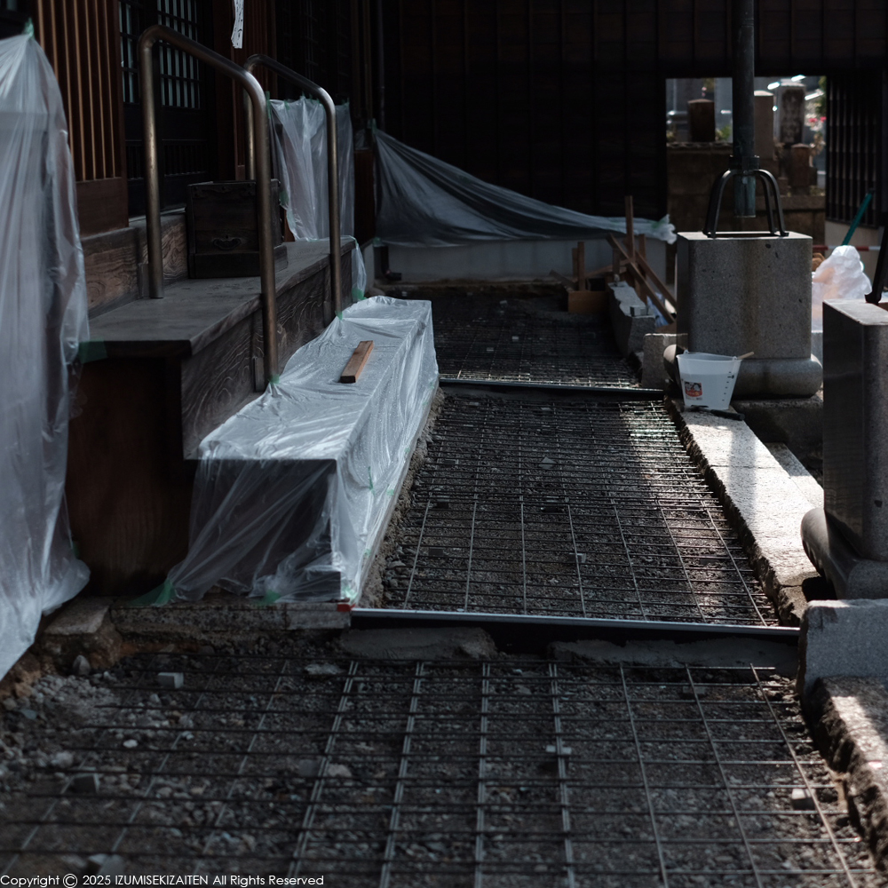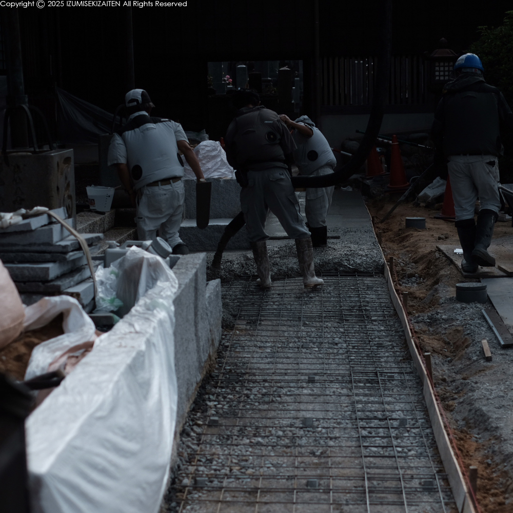 お彼岸前のある日、コンクリートの打設工事を行いました。生コンクリート6立米打設し、一部は土間仕上げもあります。猛暑の打設でして、職人さん多数参加。