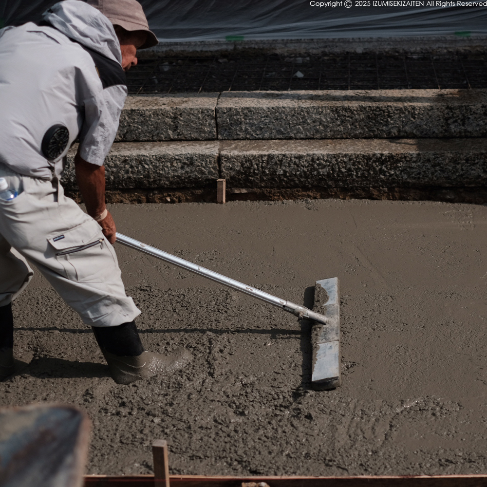手前はこの後石張りが待っていますので、仕上げ過ぎないようにしています。モルタルの定着が悪くなるので、仕上げ過ぎは厳禁。朝8時30分から6立米打設して半分は鏝押さえを行ったら10時30分くらい。人数がいないと難しい気温でした。関わっていただいた職人さん本当にありがとうございました!!!