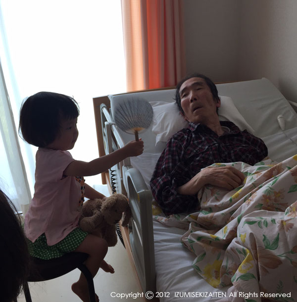 次女の会話の中で次女が覚えていることを話すとき、結構前のことを話したりするのに驚くことが多く、色んな出来事や出会う人の名前など、よく覚えているなあと思うことしばしば。出逢う人がどういう状況であるかも認識し始め、兵庫の実家の祖父母が身体が不自由で、次女なりに気になるようです。5月の帰省からよく「やまごやのばあちゃん(じいちゃん)だいじょうぶかなあ」といったニュアンスのまだまだ宇宙語に近い言葉で私に話してきます。いつもだいたい人見知りが勝ってしまうのに、今回はとても積極的にしゃべり掛けたりうちわで扇いだりしています。じいちゃんはいつも1番小さい孫に一生懸命話しかけたり何かしらふれあいたいのに、だいたい人見知りされてしまいます。今回はチャンスだよ!と思うと、今度はじいちゃん、我が家の登場で一通り驚き、嬉しがった後すぐに寝てしまいました。前日の晩、あまり眠れていなかったとのことでしたが、なんだかとても気持ちよさそうに眠っていってみんなで笑ってしまいました。結局かなり短時間のお見舞いになりましたが、これはこれでよかったねと言って施設を後にしました。