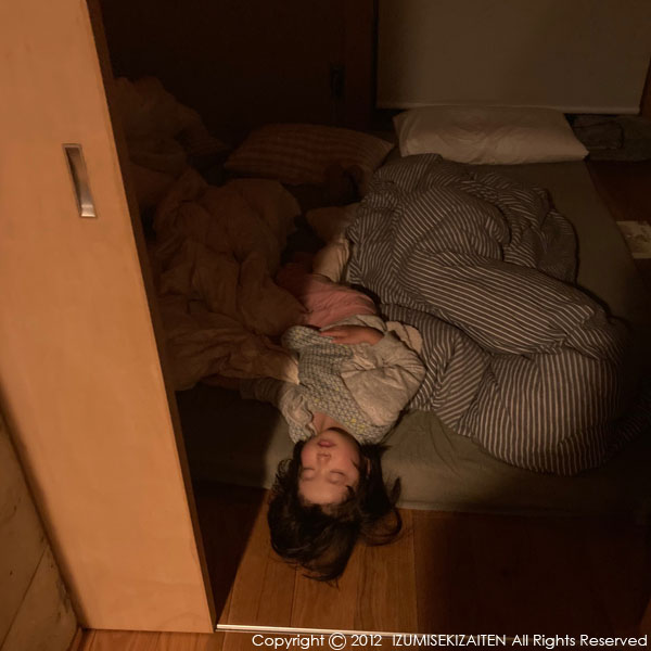 こどもたちが寝ていくのを見届けたあと、だいたいいつも夫婦で海外サスペンスドラマ(英国製が好み)などを観て再び寝床へ戻ります。ある日、少し背筋がヒヤッとするする系のモノを観た後に、ガラリと寝室の扉を開けるとこのような状態で出迎えていて、夫は思わず「ヒー!!」と言ってました。いつもは、夫・長女・次女・私の横並びで寝ていて、横方向の寝返りは私たち親2人がストッパーになっていますが、縦方向は無法地帯、こどもたちは転がりたい放題な訳でこの画像に至ります。そしてなぜか不思議なことに夫が目を覚ますと顔の横に娘の足の裏があるという状況が多々あります。親に足向けて寝る娘・・・。オイオイ。
