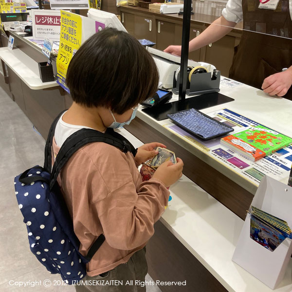 ある日自分の部屋を片付けている長女は、溜めていたお小遣いの入った財布を発見しました。少し前に高学年のお友達と一緒に遊んだときに、駅前のお店でその子達は自分のお金を使ってお菓子を買っている姿に衝撃を受けた長女は、これまで何気なくあった自分の財布とその中身を使ってみたいと初めて思ったらしく「おかあさん、おかいもの行こう」と言ってきたのでした。とりあえず何を買うかも決めず、財布と行った先で出逢ったモノを入れるリュックを持ってショッピングモールへ。長女は、何を買うかわからないけど自分で好きなモノを買える喜びに満ちていますが、意外に優柔不断な長女はなかなか決まりません。これもほしいけど、あれもほしい。違う店に行くともっと欲しいものが現れて、コレを買ってお金がなくなったことを後悔するかもしれない・・・という考えがグルグル回っているのが丸わかりでおもしろ過ぎます。何としてでも何か買いたい長女。だんだん焦ってきました。タイムリミットがやってきて、結局周囲からのアドバイスもあり、無難に本を買っていました。レジでのやりとり緊張しっぱなし。最後におつりだけもらって「おきゃくさん!商品商品!」と言われるオチまできちっとつけてくれました。