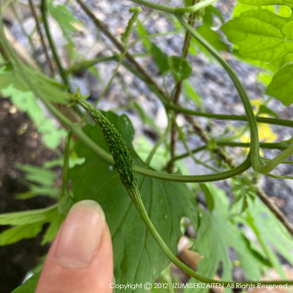 今年初めての試みゴーヤ。弱々しかった苗も気温の上昇と共に突然グングン伸びて、天井まで届きました。あとは横へ枝を張って生育してもらって、網を覆っておくれと願うのみ・・・・ではありません。遮光で頭がいっぱいでしたが、かわいい花を咲かせ初めて、とうとう見つけました小さな実!!小さいけれどもうすでに見た目がゴーヤです。キュウリよりはかなげで小さな花とは裏腹にイボイボで鬼の金棒みたいで強そうな実の見た目のギャップがおもしろい。ここまでの大きさになると、葉っぱなど触っただけでゴーヤっぽい匂いがするのも新発見でした。あとは収穫時。こどもと食べるとなると、あまりすぐ採らない方が苦みが弱くなるので良いみたいです。収穫はもうすぐ。楽しみです。