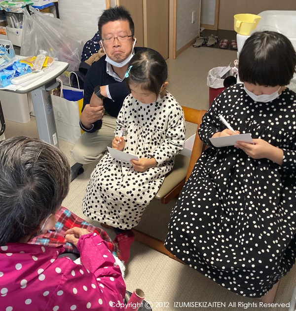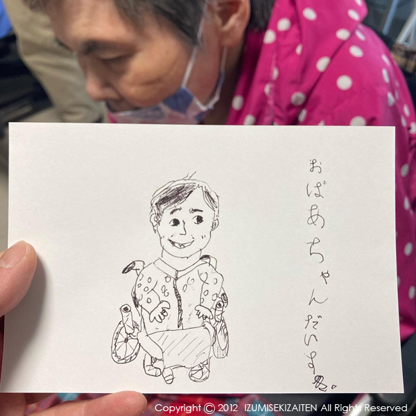 「ばあちゃんを画くね!」といってサラサラと画いたのがこの絵です。特に長女の絵がちょっとなかなかのできばえにビックリしました。ちゃんと車椅子に乗っているのがわかります。来るたびに画力を上げている長女の作品に母も大喜びでした。3人とも絵を描くことが好きなのがあふれていて邪魔しちゃいかんなと思いました。