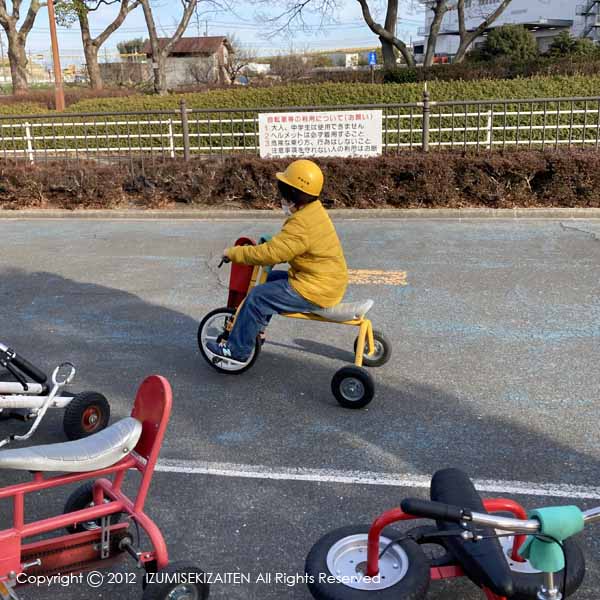 聚楽園の大仏様の後に、少し時間があったので公園をハシゴしようぜ!ということになり、ずっと気になっていた平地公園に行ってきました。東海市の弊社事務所から自宅までの主な公園はほとんど制覇していたのですが、名和の方へは初めてでした。東海市は公園がたっぷりある中で平地公園だけはちょっと違いました。土日と子供たちの長いお休みの間だけ運行しているゴーカートとおもしろ自転車コーナーがあります。しかもゴーカートは業界最安値、一人ではなく1台110円という破格っぷりです。だいたいいつもこういうおでかけに母娘3人で行って、こういう親子で乗る乗り物の時は姉妹のどちらかが一人だけさみしく待機する形をとりますが、なんと3人一緒に乗せてもらいました。続けて3回も乗ってしまいました。その後におもしろ自転車コーナーも姉妹は夢中です。私的にはまさかの工事中ばりの黄色いヘルメット姿に夢中になりました。運転するこつをつかむとずっと乗っています。私が凍え死ぬ寸前で終了です。姉妹は帰りのクルマでずっと再訪を訴え続けました。