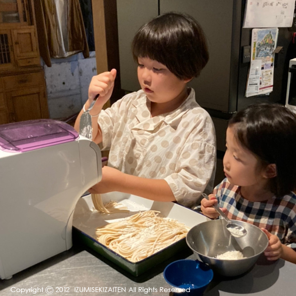 一時期あんなに熱かったヌードルメーカー熱が、引っ越しと共に、奥の納戸に仕舞われたまま稼働せずにいました。別に取りにくい所にしまい込んだわけではなかったのに、理由も無く稼働せずにいました。子らの記憶から消えかける前に長女が急に思い出していざやろう!ということで久々に登場。以前散々製麺したので、上手に出来る配分をひかえてあったので、それように計量し、スイッチを押し、計量した水を少しずつ加えて設定時間分機械がコネコネしてくれます。時間が来たら製麺されるので、粉をまぶしながら適切な長さに切断するだけ。当時幼稚園児だった長女はその切断作業だけ張り切ってやっていました。今回も2人にはお願いしましたが、多分今後は自分たちで最初から最後まで任せられそうです。麺を作ったときくだけでとてもたいそうに聞こえるので、子らのやる気と達成感の為にはもってこいです。これから鍋の季節なので再び活躍してもらおうと思います。