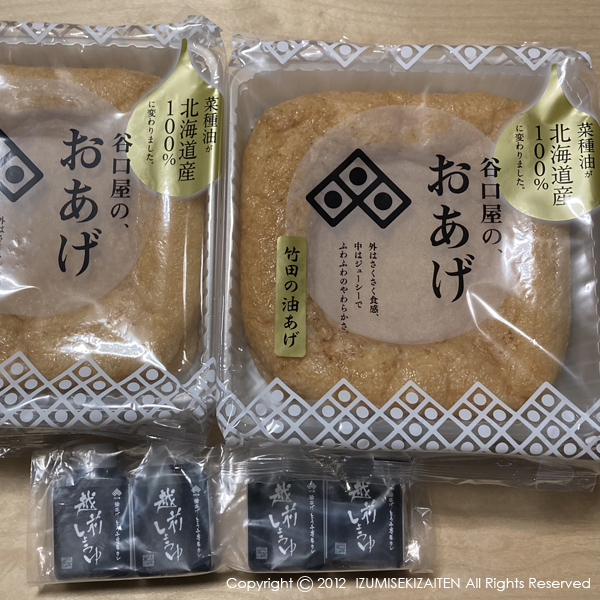 福井に住む友人から嬉しい贈り物です。おあげさんが届きました。家族全員焼いた揚げさんがあまりに好きすぎる我が家にとってはたまらないわけです。谷口屋の竹田のおあげはものすごく分厚くて、決して厚揚げでは無くあくまで揚げ。もちろん焼いて食べます。外側がカリッと香ばしく中は柔らかで軽い食感です。シンプルにお醤油だけ少しかけていただきます。本当においしい!揚げがおいしいということがどれだけ幸せか。我が家のお揚げキングは久在屋にありますが、ちょっと良い食品売り場などでみかけるとゴソッと勝手行くほどのお揚げフェチです。その時の食卓のメインの座を確実に持っていきます。こういうモノがおいしいと感じると日本人で良かったー!なんて思いますが、きっと世界も受け入れられる逸品です。ありがとうございました!