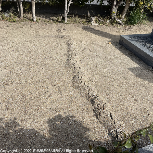 ニュース 仕事風景 トンネル DATE 2022.01.24 先日の現場視察の際に妙な生き物の痕跡を発見。仕業の主はモグラです。墓地内のあちこちにモグラの跡がありまして、お供え物を失敬しているのだとかとか、妙な想像をかき立てます。そうだとすると相当この辺りのモグラは豪勢な暮らしをしているのでしょう。こちらの墓地での工事は今月末。砂地の墓地は天候が味方しないとかなり厳しそう・・・。天気になりますように! CAT:ニュース | 仕事風景 一言石句 TOP prevnext