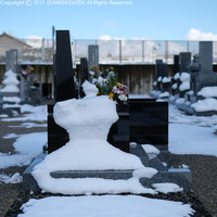 先日の大雪の後、健康の森西霊苑に足を運ぶとこの景色。どうも吹雪いたような形跡があり、石碑の袖